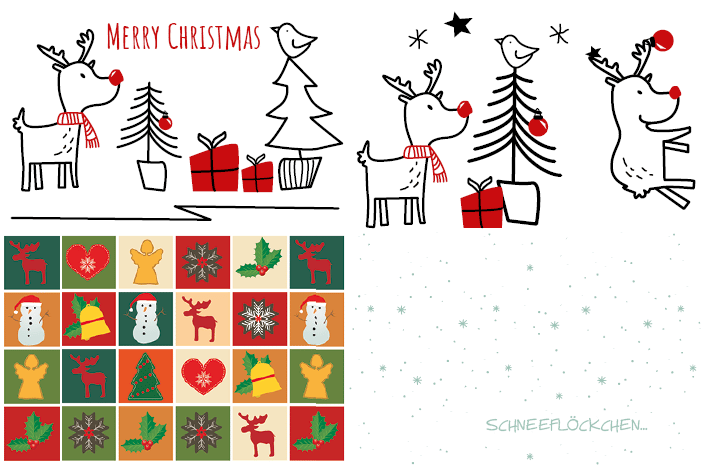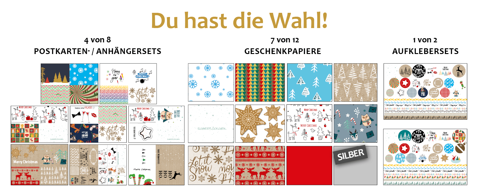 Stelle dir dein Weihnachtsbuch selbst zusammen und wähle aus den Postkarten, Geschenkpapier und Aufklebersets aus.