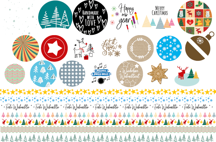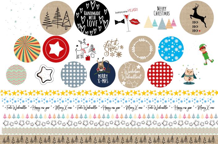 Wähle 1 von 2 Aufkleberbogen. 1 Bogen enthält 20 runde (Ø ca. 45 mm und 33 mm) und 7 lange Tapeaufkleber (297 mm Länge) zum Selbstkürzen für Bordüren um Gläser oder als Klebebandersatz. Die Motive passen super zu den Postkarten und dem Geschenkpapier.