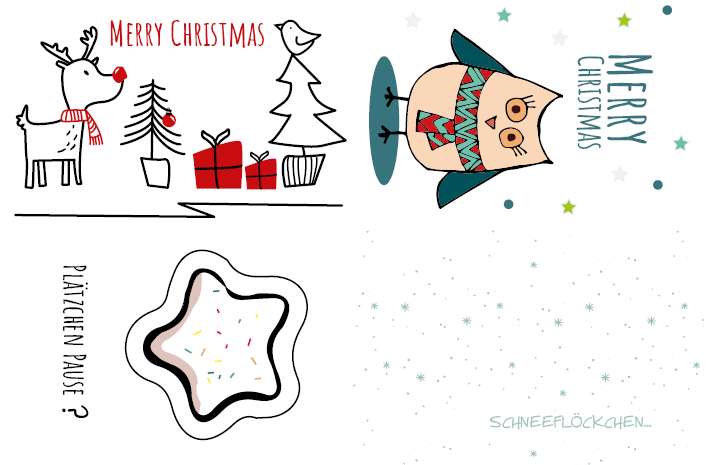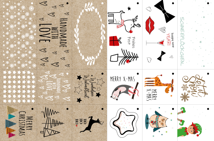Wähle aus 4 von 8 Postkarten- und Anängerbogen aus. Dieser Anhängerbogen enthält wiederum 18 verschiedene Anhängermotive, die nur nur noch ausschneiden und lochen musst. Die Rückseite bietet Platz für deinen Gruß.
